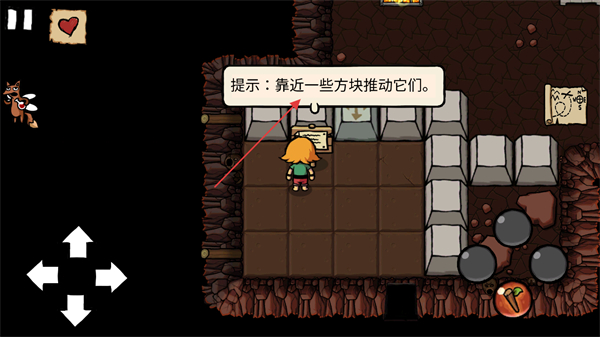 4、在游戏地图中探索时,可以靠近告示牌获得提示,这是游戏中探索、解谜的基础操作之一,需靠近方块执行推动动作以推进流程。
