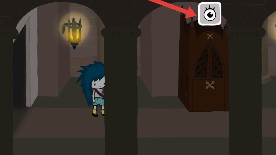 4、进入昏暗拱廊,注意墙上灯具、带钥匙图案的柜子,从之前收集的道具中寻找对应钥匙开启,点击眼睛查看。