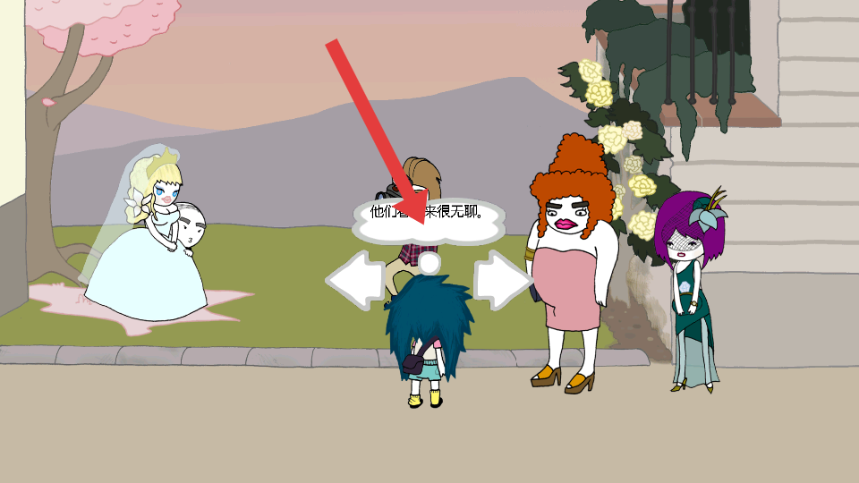 3、户外场景中,遇到穿婚纱人物、红卷发角色等,先触发对话如他们看起来很无聊相关内容,获取场景关联信息。