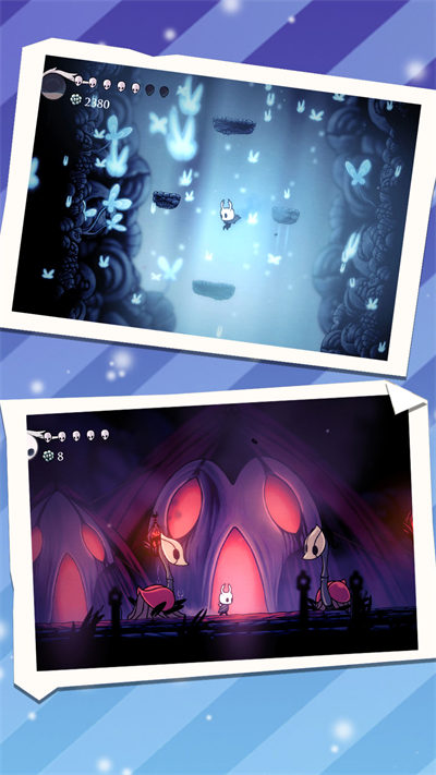 1、左右和跳起控制小小骑士,跳过悬崖,台阶等障碍,躲避藏在悬崖下的敌人;