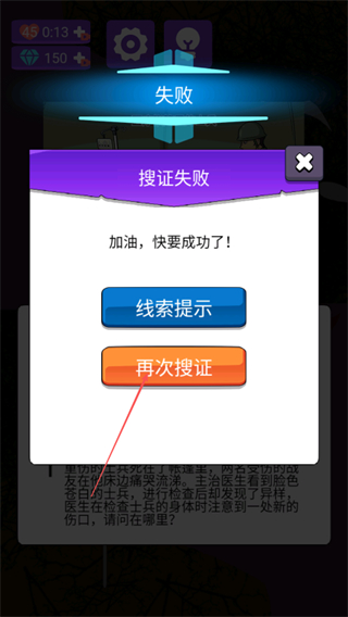 2、若搜证失败,可选择再次搜证重新尝试,或点击线索提示获取帮助。