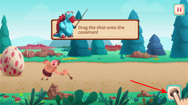 1、进入游戏后,拖拽石弹到穴居人身上,这是发起攻击的关键操作,拖拽后可触发战斗,推进进程。