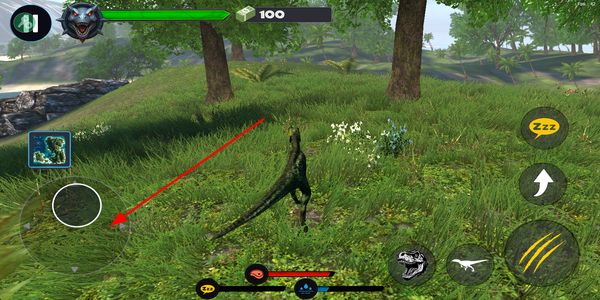 2、操控移动按钮控制恐龙在场景中行动,查看地图了解所处区域,同时关注恐龙的状态条,维持其生存所需的状态。