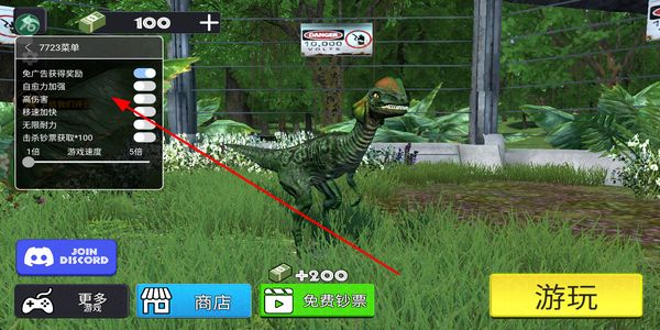 1、菜单中选择功能选项,开启如高伤害等增益效果,调整游戏速度,点击游玩按钮进入游戏,开启恐龙生存挑战。