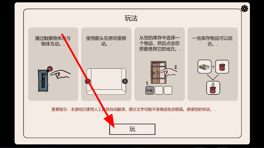 1、先查看玩法指引,明确互动、移动、物品选择使用与组合等操作方式,按照指引开启解谜,为后续寻找线索道具等操作打好基础。