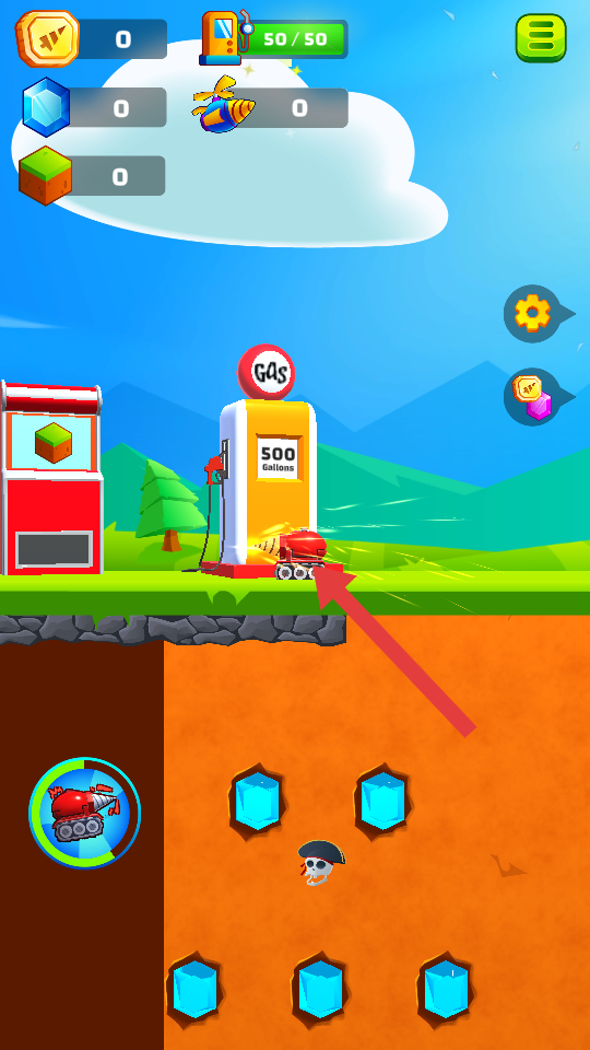 1、操控红色挖矿车朝着箭头指向的加油站方向移动,补充燃油,确保挖矿车有足够动力进行地下挖矿作业。
