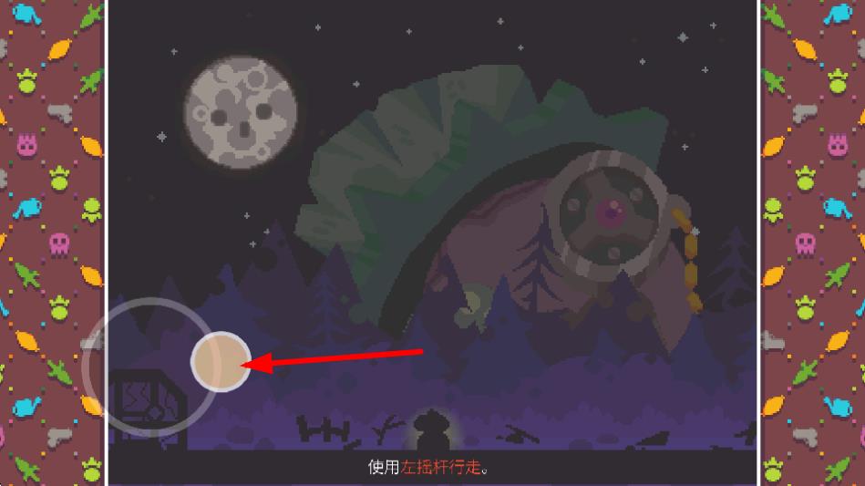 2、通过左摇杆控制角色行走,这是探索场景、与NPC互动的基础操作,界面中的森林和月亮场景营造出冒险氛围。