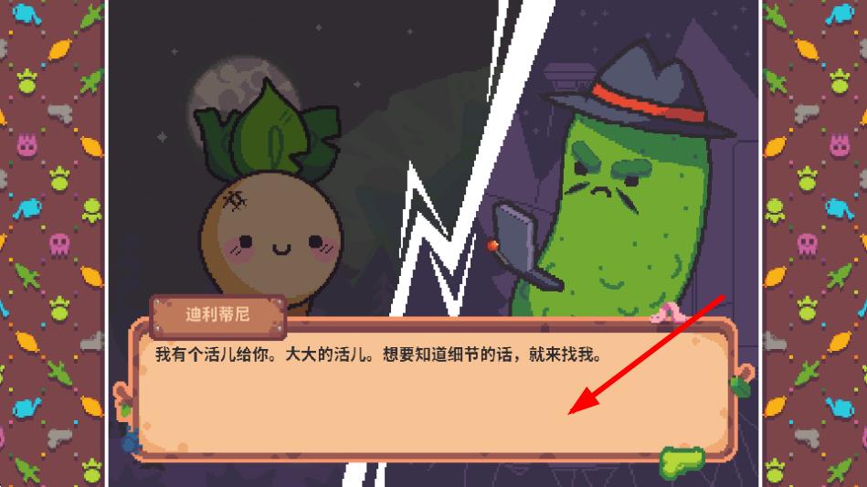 1、在像素风格游戏,角色迪利蒂尼发布任务,对话我有个活儿给你,大大的活儿,想要知道细节的话,就来找我。