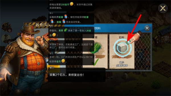 1、在任务界面点击红色箭头指向的石料道具,可选中该道具用于后续修复谷仓的任务。