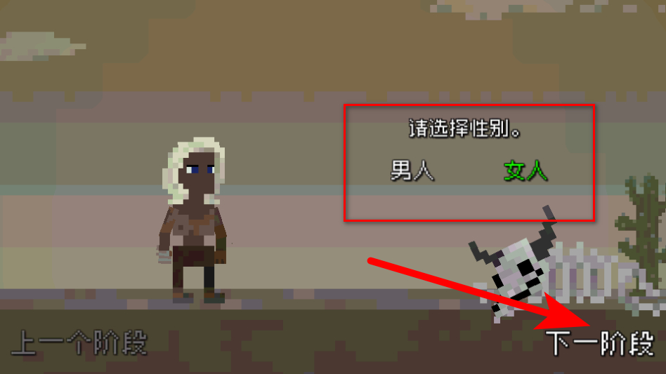 2、在角色创建页面,选择男人或女人确定角色性别后,点击下一阶段推进流程。
