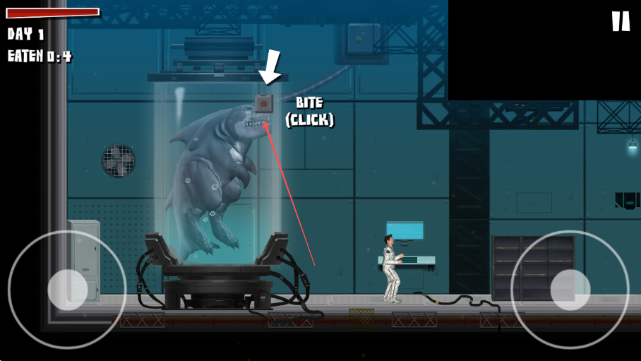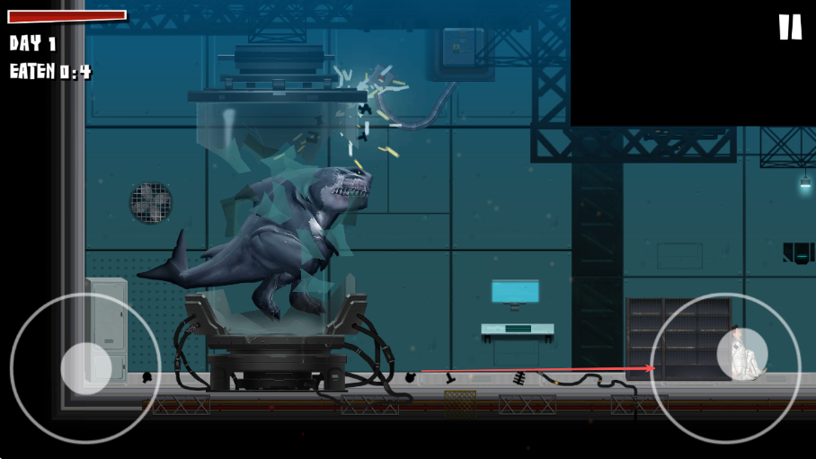 1、游戏开始查看左上角DAY1和EATEN0:4,看到BITE提示,点击按钮让鲨鱼龙咬碎玻璃。