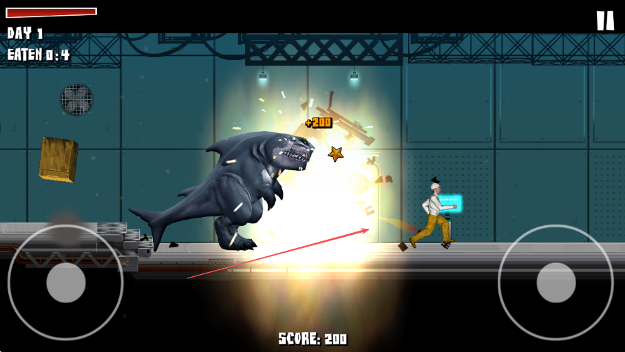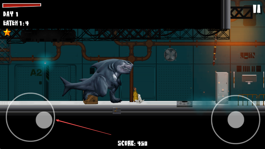 4、通过左下角虚拟按键控制鲨鱼龙移动,尽可能在当天完成EATEN目标数量获取更高分。