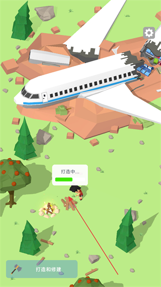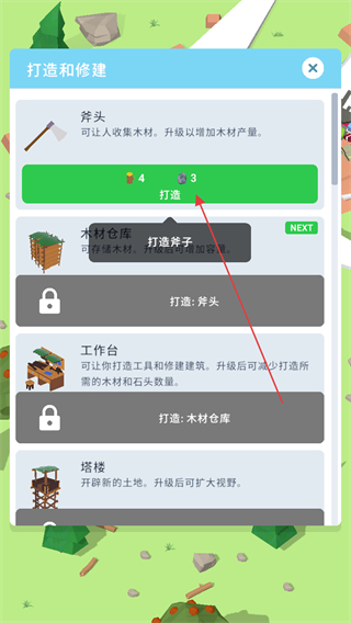 1、在打造和修建界面,消耗资源点击打造按钮,获取斧头工具,用于收集木材。