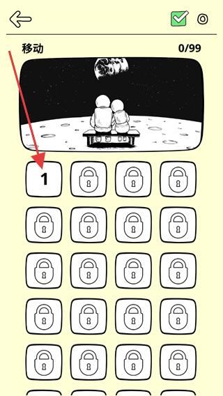 2、在移动板块展开的关卡列表中,找到标有1的未锁定关卡,点击该关卡选项,就能进入对应的游戏关卡开始挑战。