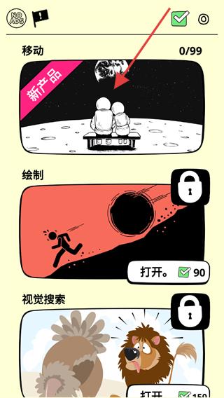 1、进入游戏界面后,找到标有移动的板块,该板块含新产品标识,点击指引指向的画面区域,可进入对应关卡选择界面。