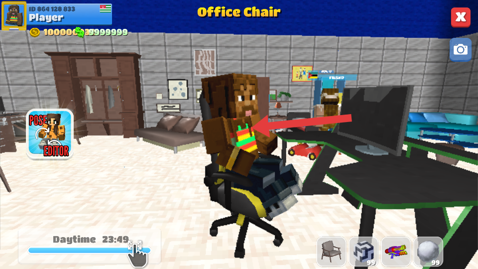 1、进入游戏后,在室内场景,如带有家具、办公区域的场景中,可操控角色与各类物品互动:靠近办公椅时,触发Office Chair交互提示。