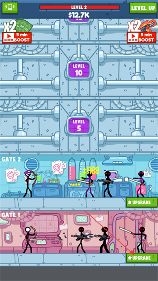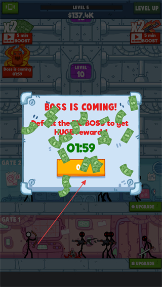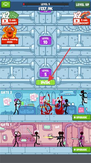 2、根据需求选择是否花费金钱数量升级火柴人获取金钱的速度和每分钟的攻击伤害。