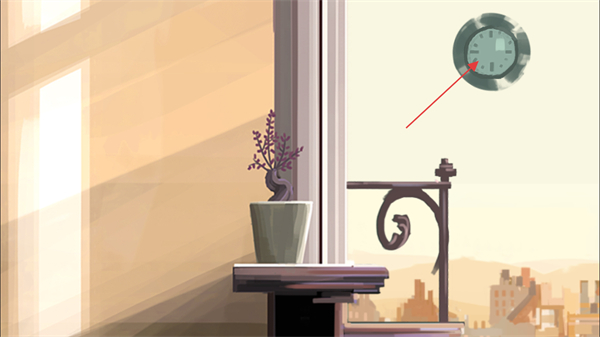 4、进入室内场景后,观察到悬浮的时钟元素,点击悬浮的时钟可以看到两种不同的世界,探索该室内区域的内容。