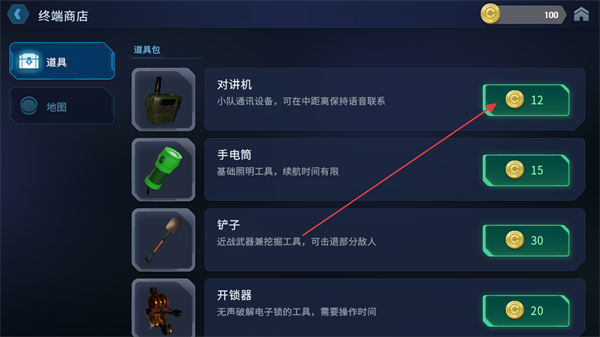 4、进入终端商店,消耗金币购买道具如对讲机,为后续探索做准备。