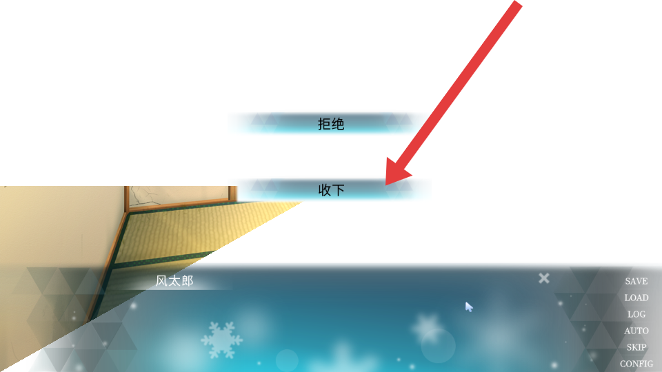 3、遇到拒绝和收下的选项时,点击箭头指向的收下选项,将触发该选择对应的剧情,影响角色关系。