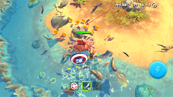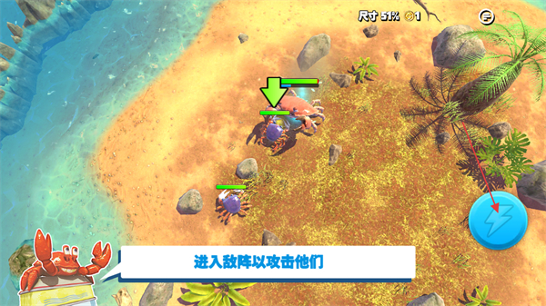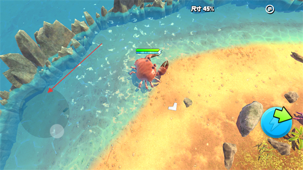 1、通过滑动左侧屏幕控制螃蟹的移动,寻找岛屿上的猎物。
