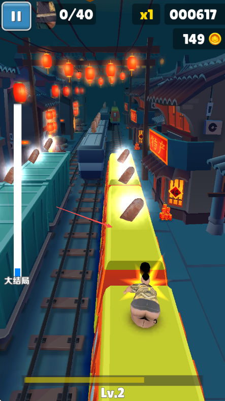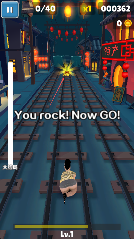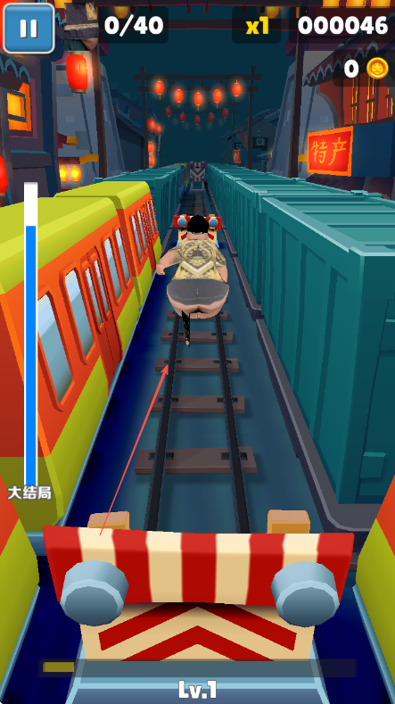 1、进入游戏,查看屏幕上方的进度条倍数和分数,操控角色在铁轨间移动。