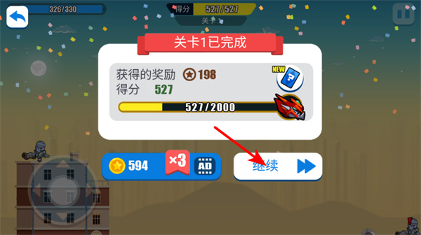 4、点击继续按钮,这是开启新关卡的基础操作,点击后可进入下一关,挑战更复杂的场景。