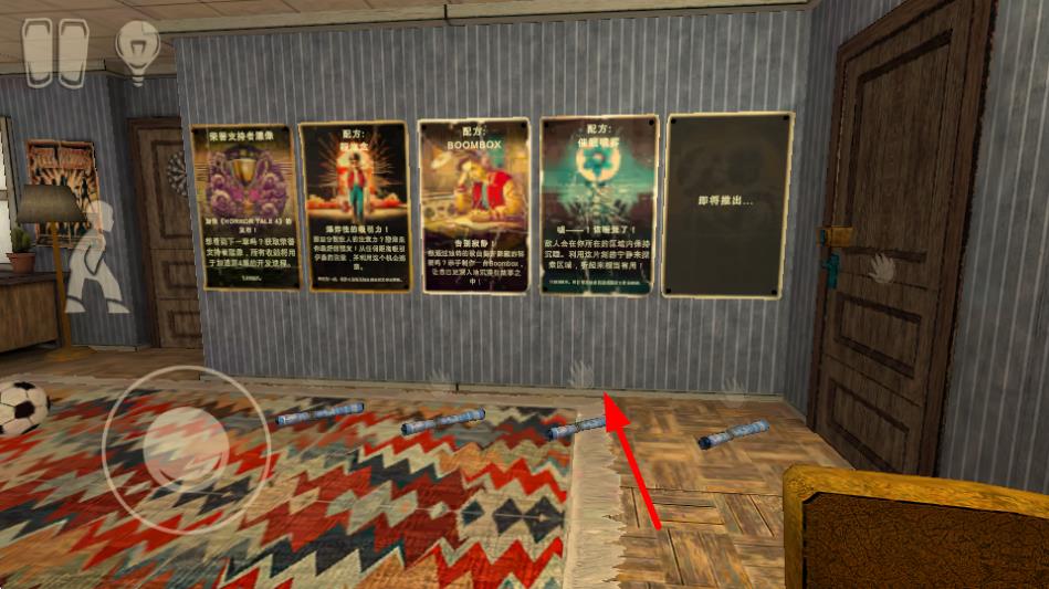 3、房间内的配方海报展示了不同物品的制作方法,如BOOMBOX等,这些配方是制作道具、推进解谜的关键信息。