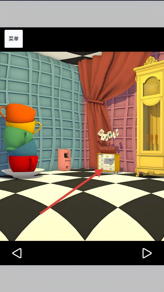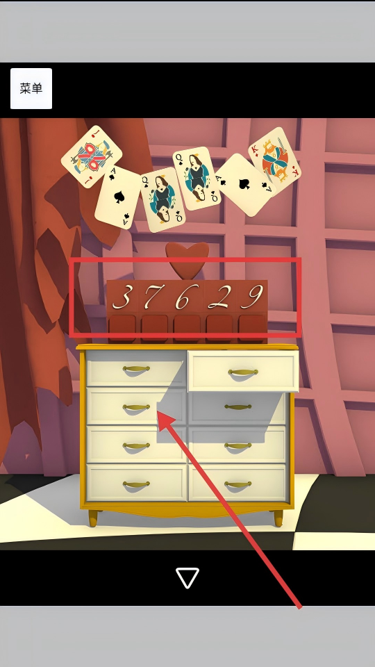 2、聚焦带有37629数字的柜子,尝试点击抽屉,结合周围扑克牌元素,探索抽屉里的线索。