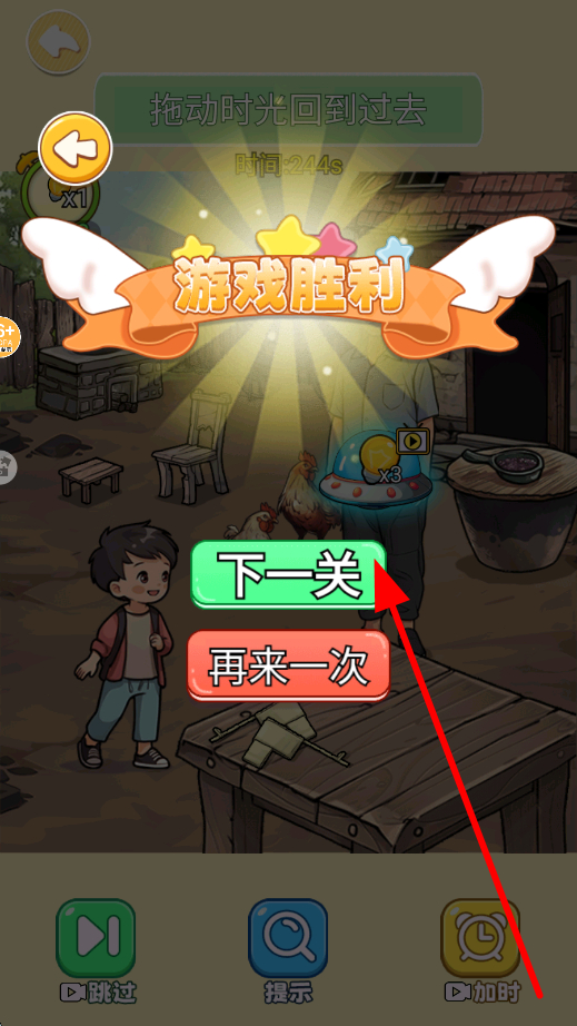 4、成功完成当前关卡的时光穿越与探索等操作后,显示游戏胜利,点击下一关,即可进入下一段时光旅程,继续体验。