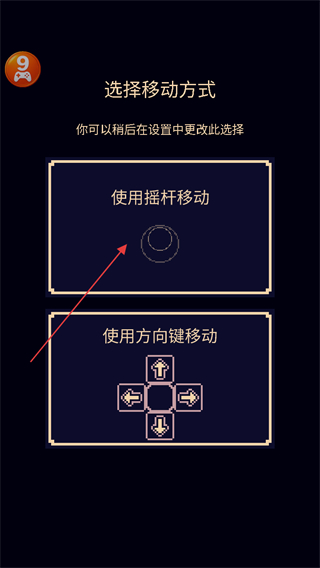 3、进入选择移动方式界面,可选使用摇杆移动或使用方向键移动后续还能在设置中更改此选择。