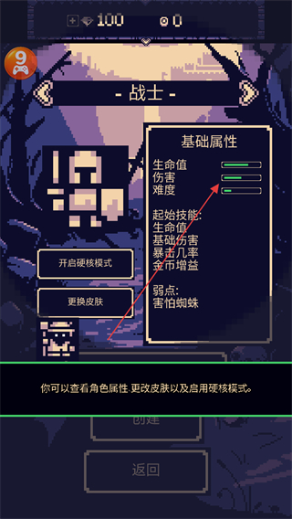 1、在战士角色界面可查看基础属性及弱点,还能点击开启硬核模式,更换皮肤完成角色相关设置。
