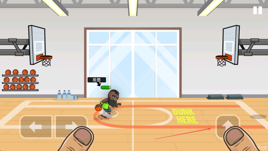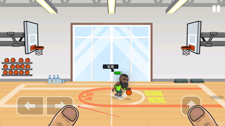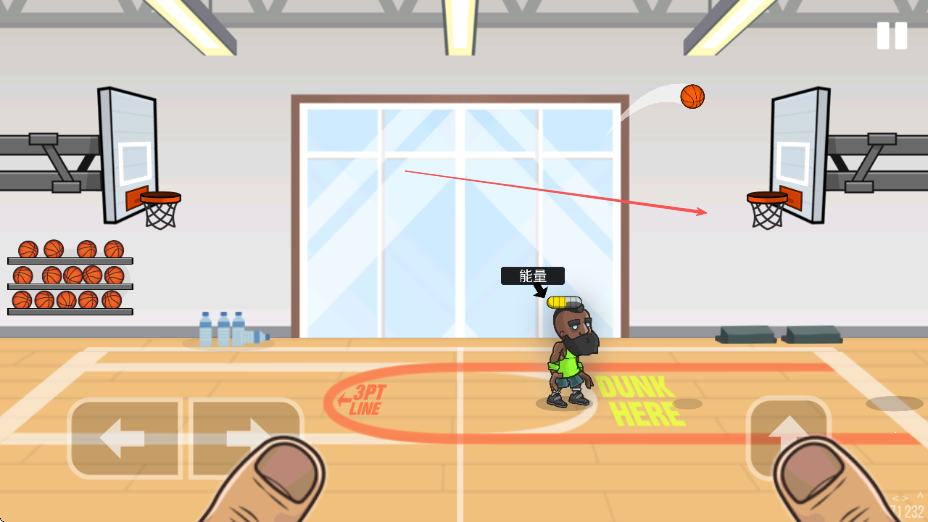 1、通过屏幕下方左右方向键控制角色移动,靠近篮球使其悬浮在身边获取篮球。