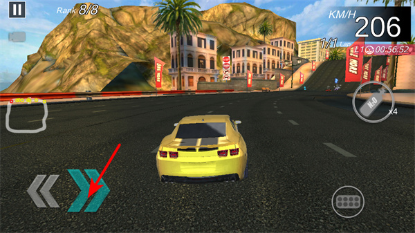 2、通过左侧方向按钮操控赛车转向,在弯道和复杂路段及时调整方向,避免撞墙或偏离赛道,确保赛车稳定行驶。