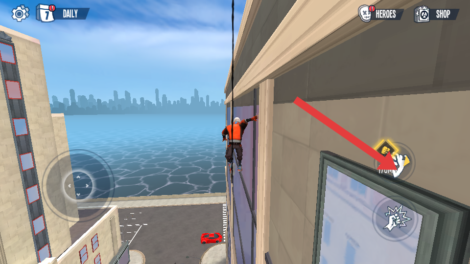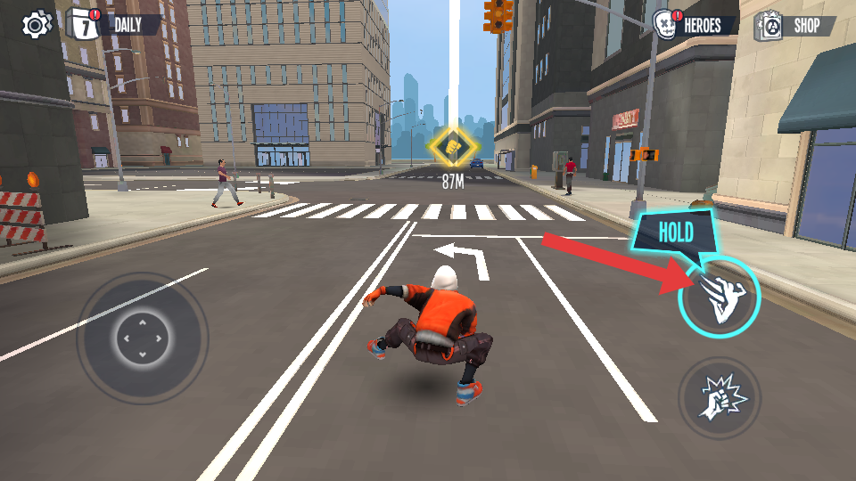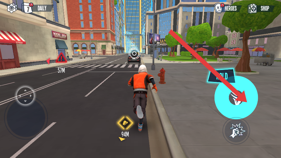1、进入城市跑酷场景后,先熟悉角色基础操作,点击屏幕左侧控制角色左右移动,右侧跳跃按钮用于跨越街道缝隙。