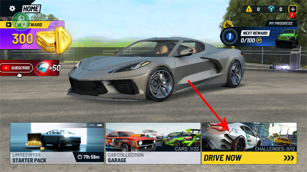 1、在游戏主界面点击DRIVE NOW按钮,这是进入赛车驾驶玩法的关键操作,点击后会开启驾驶场景,展开城市赛车的核心体验。