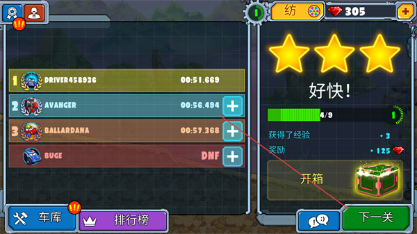 4、完成比赛获得三星评价,领取125钻石奖励,点击“下一关”继续挑战。