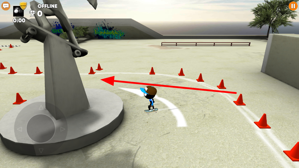 4、滑板场景中,可以操控火柴人围绕雕塑等物体穿梭,通过左侧摇杆灵活调整滑板方向,在穿梭过程中,保持滑板的稳定,尽情体验滑板的乐趣。