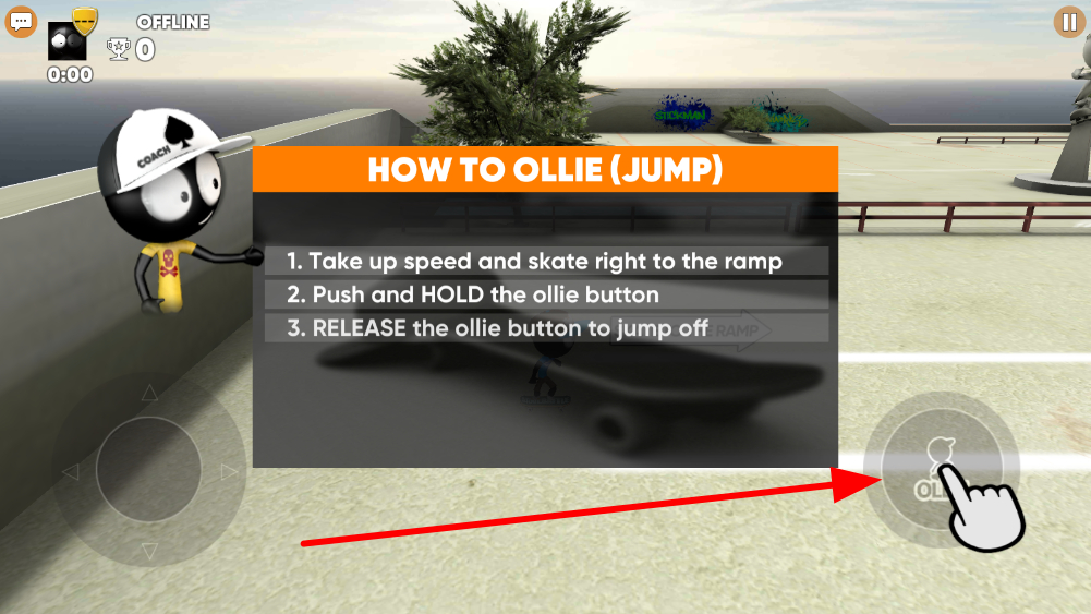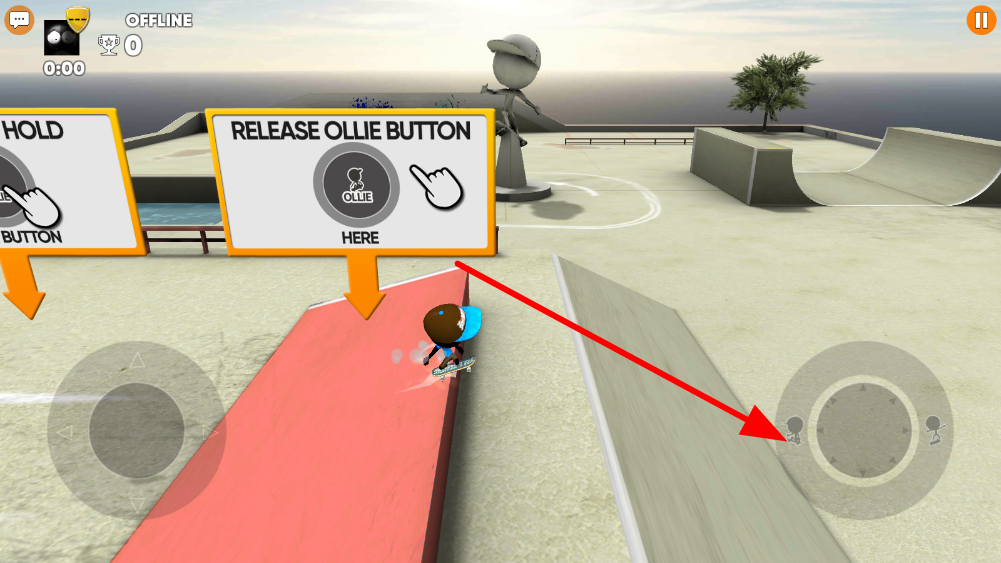3、在带有坡道等地形的场景中,运用学到的ollie技巧,让滑板顺利越过坡道等障碍,同时注意场景中的各类标识,按照提示完成动作。