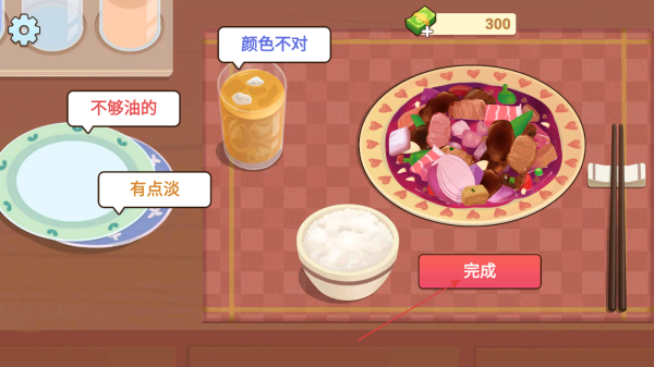 4、确认食材煎制完成后,点击锅具旁的盘子,将煎好的青椒五花肉盛入盘中,装盘后游戏会自动显示菜品评价,仔细查看颜色不对不够油的有点淡等反馈内容。