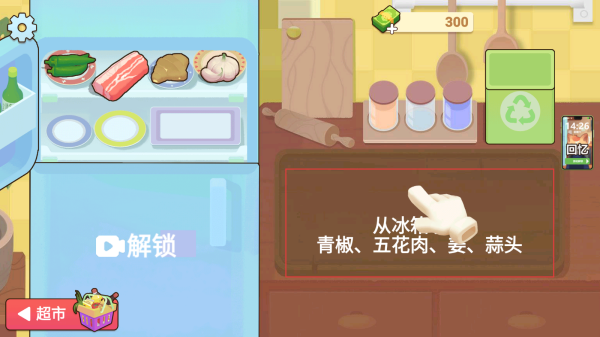 1、先点击画面中的冰箱图标,从中依次取出青椒、五花肉、姜和蒜头,将取出的食材放在旁边的操作台上,接着用清水冲洗青椒去除杂质,再用刀具把五花肉切成均匀小块。