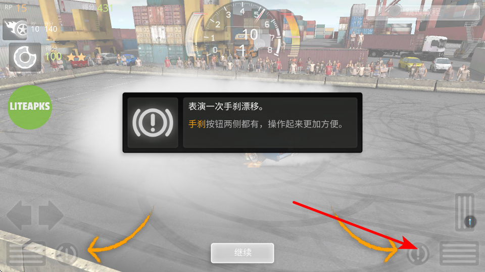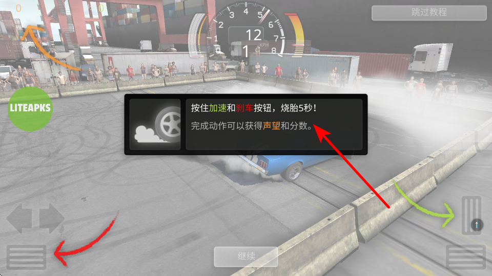 2、强化烧胎技巧,严格按照教程,按住加速和刹车按钮持续烧胎5秒,确保动作完成以获取声望和分数奖励,提升成就。