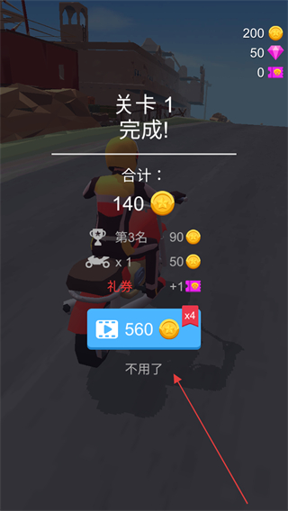 4、关卡完成后,领取对应奖励金币、礼券等,点击不用了关闭额外奖励弹窗。