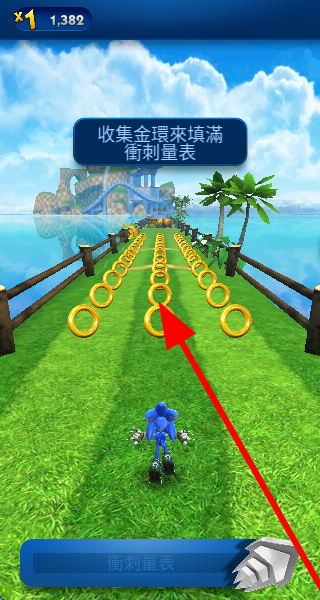 2、在跑道上有很多金环,要努力收集它们,这些金环能填满冲刺量表,助力后续冲刺,让奔跑更顺畅。