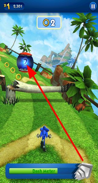 4、遇到带问号的罐子,靠近它,会触发随机效果,可能得到道具或增益,帮助索尼克更好地在跑道上前进。