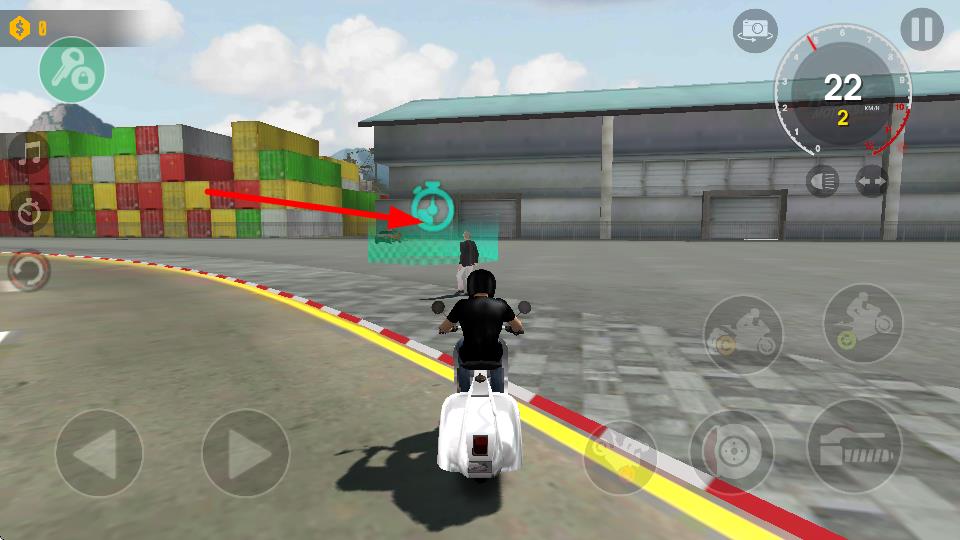 3、驾驶摩托车靠近箭头指向的绿色计时图标区域,可触发计时任务,完成任务可获取相应奖励,推进进程。