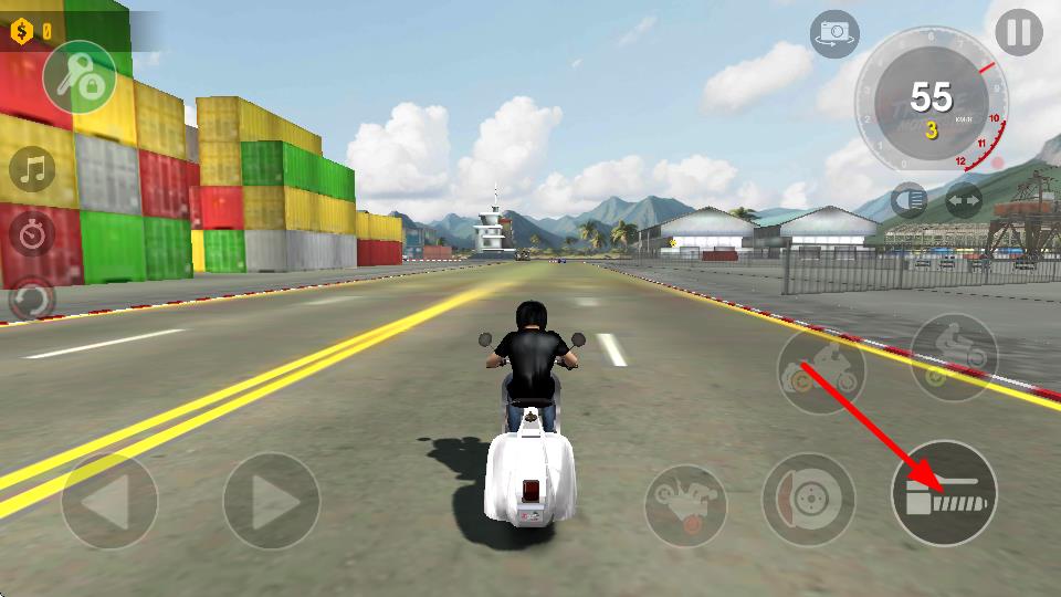 4、再次点击右侧油门按键,可继续提升摩托车速度,在直道上保持高速行驶,以缩短行驶时间,获取成绩。