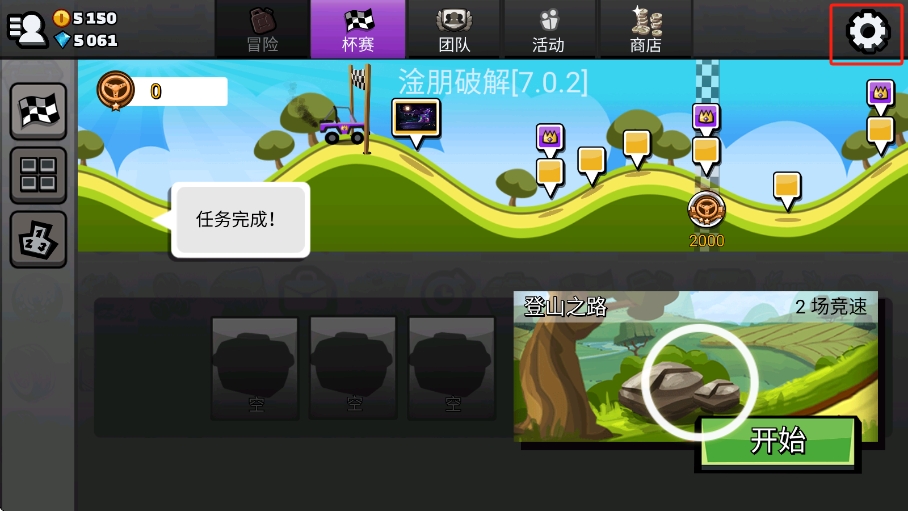冒险模式延续了《登山赛车》一贯的经典无尽模式,目前总共有4张冒险地图。当玩家在冒险地图里达到指定的距离数,便可解锁“杯赛”模式中的对应地图,可以和其他玩家一起进行比拼。