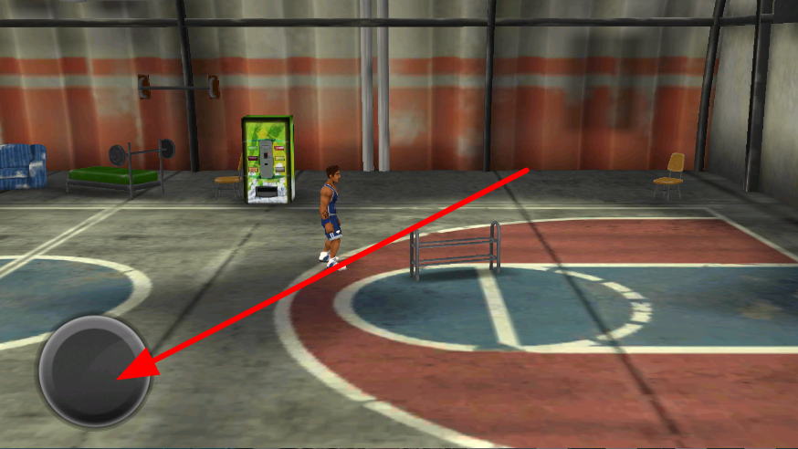 1、玩家在球场中,拖动左下角虚拟摇杆,控制角色向不同方向行走,自由在球场内移动,为拿取篮球和投篮等动作做准备。
