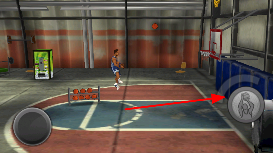 3、当角色拿到篮球后,点击右侧投篮按钮,角色会做出投篮动作,将篮球投向篮筐,尝试让篮球顺利进入篮筐得分。